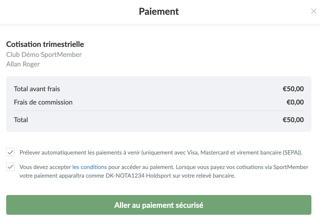 Sur la page de paiement, vous verrez toutes les informations pertinentes : le montant total de la cotisation, les frais de commission (dans certains cas, elle peut être payée par le club ou le membre), les termes et conditions que vous DEVEZ accepter.